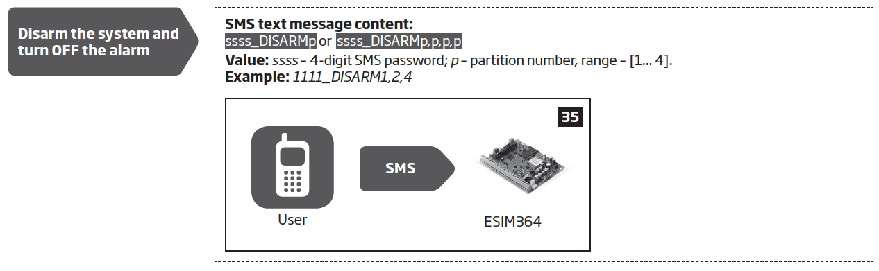Disarm Eldes system with SMS To disarm the system and turn OFF the alarm by SMS text message, send the following text to the system‘s phone number from any of 10 available user phone numbers: DISARM ELDES with SMS